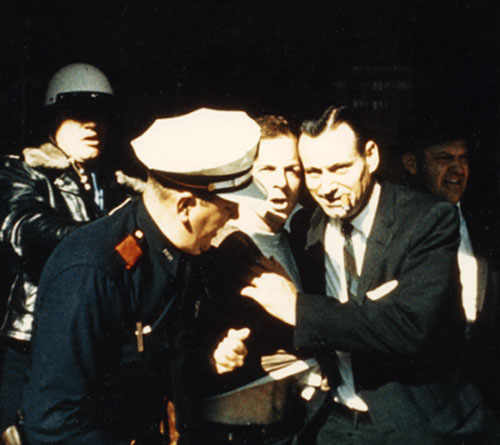 Patrol cars bearing at least 15 officers converged on the theatre. They entered the darkened theatre from the front and rear and searched the balcony. The lights went on. Brewer stepped on to the stage and pointed out Oswald, who sat alone in the rear of the main floor near the right center aisle. Officer McDonald ordered him to his feet; “Well, it’s all over now,” he heard Oswald say, and then the assault and fight. Oswald struck him between the eyes and pulled his gun; McDonald struck back and grabbed the gun. Three more officers moved in and grabbed Oswald from the front, rear, and side. Oswald tried to shoot his weapon but it misfired (the webbing of McDonald’s hand might have come between the hammer and the cartridge). After a struggle, the suspect was subdued and handcuffed and lead out of the theatre: he muttered curses and hollered about police brutality. At 1:51 the police reported by radio they were on their way to headquarters with the suspected killer of Officer Tippit. By the time they got to the station Oswald, the only employee missing at the School Book Depository, was identified as a prime suspect in the assassination of President Kennedy.