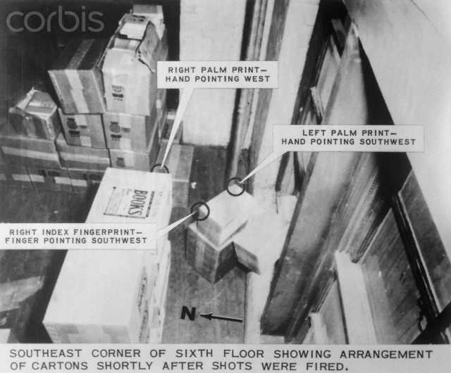 Minutes before the Presidential Motorcade came through downtown Dallas in the early afternoon, he was seen in the sixth floor window of the Texas School Book Depository; the description given to the police was accurate enough for a police officer to stop him on the streets within the hour. It was a mild sunny day late in November. He shot the President at 12:30 pm, left the rifle and the paper bag he used to bring it to work on the sixth floor (the bag by the window, the rifle between boxes across the room near the stairs), took the stairwell to the lunch room on the second floor where he was stopped at gunpoint by Patrolman M. L. Baker, who had just entered the building. Oswald was calm; he was wearing pants and a T-shirt. The accompanying supervisor, Roy Truly, recognized him as one of the workers. They let him go. He bought a bottle of Coca-Cola at the coke machine, and then walked through the clerical office toward the door leading to stairs at the front of the building. Mrs. R. A. Reid, the office supervisor, had been watching the parade on the sidewalk; she rushed back inside after hearing three shots and saw him as he headed to the door. “The President has been shot,” she said. Oswald mumbled something and kept on walking. About three minutes had passed since he shot the President and the building was not yet sealed.