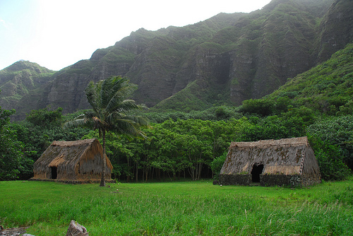 The first people to inhabit Hawaii were Polynesians who, starting about 1300 years ago, crossed thousands of miles of ocean, probably in double-canoes with sails, coming in successive waves from the from the Marquesas Islands, Bora Bora and Tahiti. In the warm climate and trade winds of Hawaii they settled in chiefdoms ruled by chiefs, some growing to encompass whole islands, and were entirely self-sustaining with fishing, some farming and livestock, and picking fruit. They worshipped many gods, created myths, and practiced human sacrifice. They thrived on the beautiful islands, living in thatched villages by sandy blue shores beneath the high cliffs of green mountains. In the evening while men beat bongos, the women danced in grass skirts gracefully moving their arms and hips. Late in the 18th century all Hawaiians came under the rule of King Kamehameha the Great. When Captain Cook arrived on sailing ships in 1778, the native population was almost half a million.