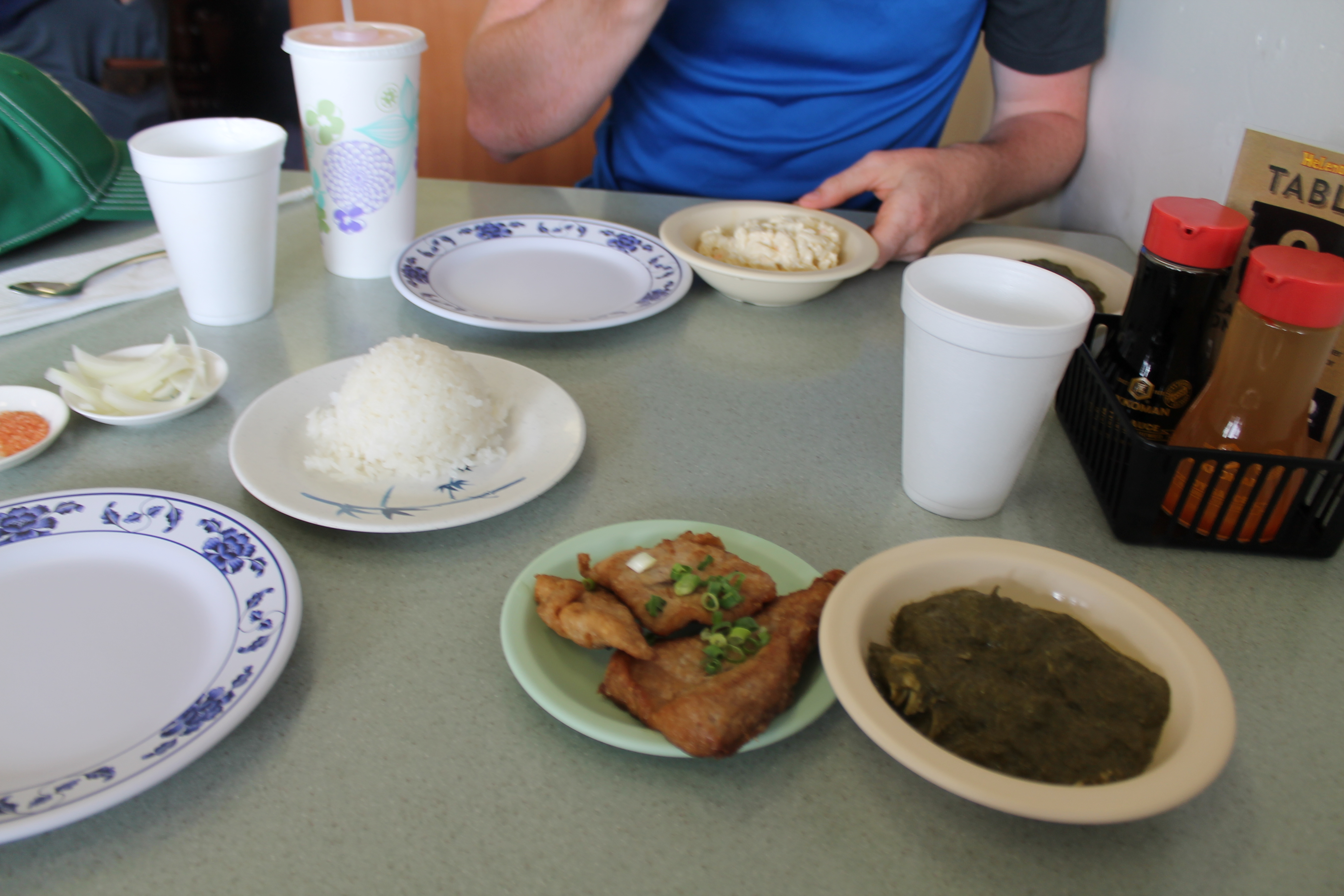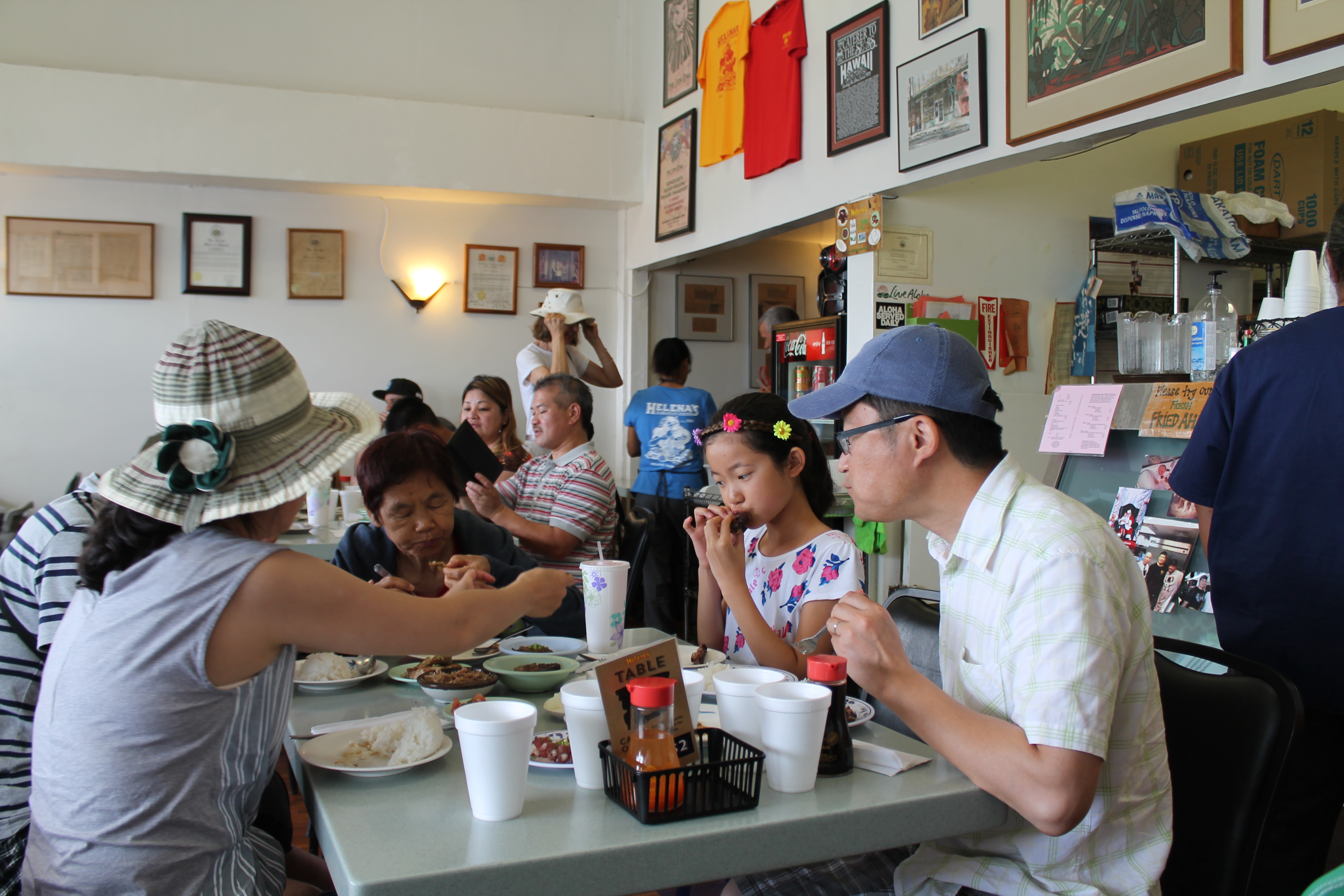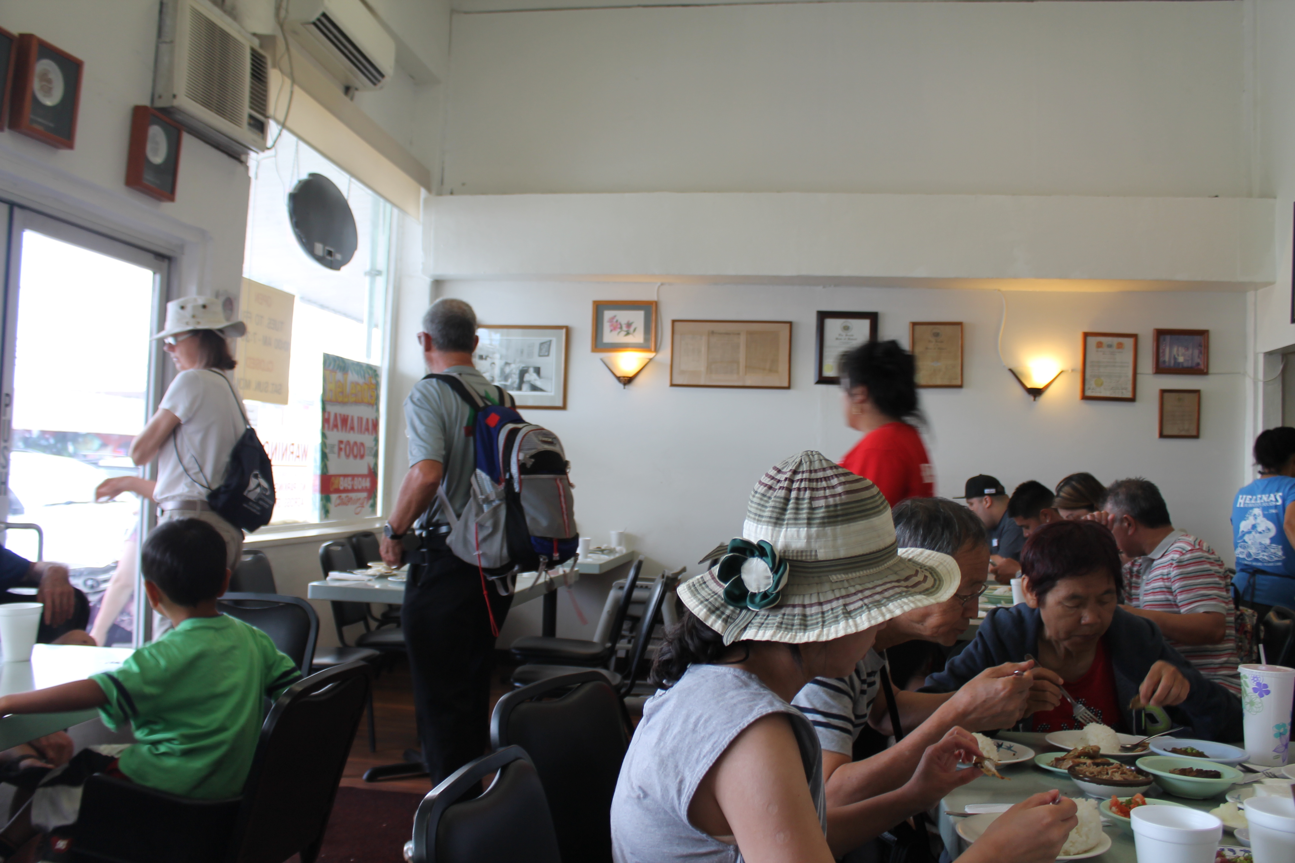 Many years ago on a long trip with my father to see the great natural sights out west, we evolved a strategy of eating meals which I use to this day. On about the third day of our western trip, tiring of Big Macs and french fries and not wanting to pay a big price, I remembered once stopping in a small town in Indiana that had a cafeteria that served the best salisbury steaks and corn souffle in the Midwest and realized that maybe all small towns might have such a place. My father agreed and the next town we came to, a small town in Colorado, we exited the highway to the main street and asked a local where would he go to eat dinner. He pointed across the street and we parked the car and walked into a clean well lit place that had mirrors and friendly waitresses who acted like they already knew you, which they may well have. We ordered, and the waitress brought a house salad, fried chicken, corn-on-the-cobb, and hot dinner rolls that made you hungry to look at and was even tastier when you started eating. We used this method for the rest of the trip and some of the places were fabulous: a crowded little restaurant in a small town in Nebraska served the best steak I have ever eaten, and somewhere in Idaho I had a pork tenderloin and baked potato that made me forget everything else. So any time I’m in a new place or on the road I will often look for a spot that all the locals love. And in Honolulu my son and I stuck gold at a place called Helena’s Hawaiian Food.