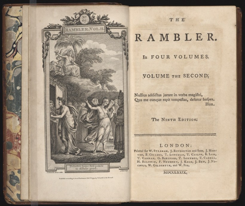 Despite all his achievements, Johnson had neither widespread fame nor much financial reward. This changed with his Rambler essays, which placed his name on everyone’s lips. After so much work with the Dictionary he was hungry to express himself fully again, and the Rambler with topics such as education, marriage, wealth, the pride of Londoners, the legal profession and criminality, the arts and theatre, fops, drinking and gambling, prostitution and poverty, gave a platform to interact with the reading public not as a scholar but as a fully engaged guide to the human mind. His persistence through his struggles as an author, scholar, and melancholic, his loneliness and anger over an oppressive society, and a temporary stall with his Dictionary shaped his philosophical and moral voice for the Rambler, which he began publishing on March 20, 1750.