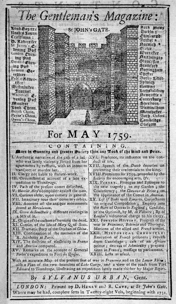 Now having a book to his name, he returned to Lichfield in 1734, where, languishing at home with his mother and brother, he found solace with Walmesley at the Bishop’s Place where he again encountered David Garrick and an expanding group of ladies. Wanting to earn more money by writing, he wrote to David Cave in London, an editor, printer, and publisher who had founded The Gentleman’s Magazine publishing monthly digests of news and articles from other papers, and general information about the London entertainment world, much of it gossipy, creating a convenient way for Londoners to keep up with happenings in the city. The magazine sold in the provinces, too, and was the most famous periodical of the eighteenth century. In his letter, Johnson offered to overhaul the poetry section.